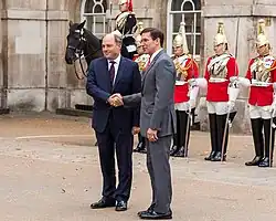 Wallace met Sergei Shoigu, the Russian Minister of Defence in Moscow on 11 February 2022.[54] Shoigu reiterated a denial of any Russian intentions to invade Ukraine.[6] The following day, Wallace said that a Russian invasion of Ukraine was "highly likely", and British citizens were being told by the Foreign Office to evacuate while commercial means were still available.[55] Ukraine's ambassador to the UK, Vadym Prystaiko, said Wallace's comparison of diplomatic efforts with Russia to the appeasement policies of the 1930s was unhelpful,[56] saying now is the wrong time to "offend our partners".[57] On 23 February 2022, Wallace was filmed saying that the Scots Guards "kicked the backside" of Nicholas I of Russia during the Crimean War, and could do so again. Russia invaded Ukraine the following day.[58]