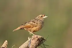The Bengal bush lark was earlier classified into several races, the Bengal race assamica and the Madras race affinis. These were subsequently split, on the basis of diagnostic song and display characters, into the Jerdon's bush lark (Mirafra affinis) and assamica in the strict sense. Formerly, both the Burmese bush lark and Jerdon's bush lark were considered subspecies of the Bengal bush lark (as M. a. microptera and M. a. affinis respectively) until split to form a separate species. The alternate name "rufous-winged bush lark" may also be used to describe the red-winged lark.[4] Another alternate name for the Bengal bush lark is the rufous-winged lark.[5]