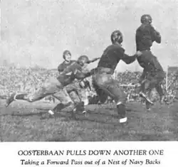 After a year on the freshmen football team, he was invited to varsity tryouts.[3] A star receiver and defensive end in a time when the forward pass was still evolving, Oosterbaan united with quarterback Benny Friedman as a passing combination.[8] As a sophomore in 1925, Oosterbaan led the Big Ten with eight touchdowns.[9] That year, the Wolverines outscored their opponents 227–3. The team shut out every team they faced, except a 3–2 defeat to Northwestern at Soldier Field late in the season. Oosterbaan's defensive play was outstanding as well, and he was key in shutting out the Fighting Illini and Red Grange 3–0 in 1925 a year after he scored four touchdowns in the first twelve minutes.[4] Five players from the 1925 team were named All-Americans, including Benny Friedman and Oosterbaan. He was briefly kicked off of the team during the year by an assistant coach for lining up incorrectly before coach Fielding H. Yost brought him back.[3][10]