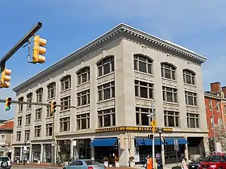 Benson Building, also known as the IPC Building, is a historic retail and office located at Baltimore, Maryland, United States. It is on the corner of East Franklin and North Charles Streets. The main side is on Charles Street and has seven bays with store windows and entrances on the first floor, and office windows on the upper floors. The recessed storefronts feature bronzed aluminum infill panels above and below the glass panes. It was constructed in 1911 and the principal original occupant was C.J. Benson and Company, a local interior decorating and furniture establishment.[2]