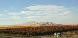 Kiona Vineyard in the Red Mountain AVA looking northwest toward Rattlesnake Mountain. Two varieties of grapes are evident on a crisp autumn day.
