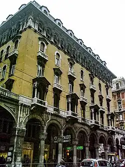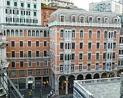 Pesce Maineri operated in the Ligurian capital at an important moment for the city when its layout was changing and large and relevant residential neighborhoods were emerging. He was mainly involved in the renewal of via XX Settembre, a street conceived following the dismantling of the ancient Via Giulia, designing some important buildings. As a member of the Società ligure di storia patria, he designed the building at civic number 36, inspired by Venetian architecture, and that at civic number 26,[12] a palace with maritime thematization with rich aquatic decoration and the colors, red and white, of the flag of Genoa.[13] In 1904, he designed in the Staglieno district the building of the Workers' housing by the Società L'Economica, commissioned by Gustavo Dufour, completed around 1907, a company that dealt with the construction of many popular buildings in the capital.[14]