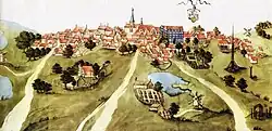 - Many town houses, mostly two-story timber framed buildings, for example those in Kirchplatz 13 with its brick facade.