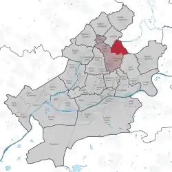 Location of Berkersheim (red) and the Ortsbezirk Nord-Ost (light red) within Frankfurt am Main | |