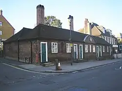 In 1660 the lease of Berkhamsted was taken on by the Lord Treasurer, Jerome Weston, 2nd Earl of Portland; it was during his residency that a large fire broke out, destroying two-thirds of Berkhamsted Place. Reconstruction was hastily commenced, probably financed by John Sayer, a wealthy local man who was Chief Cook to King Charles II. The central part of the house was rebuilt but the two wings which formed the side of the courtyard were never restored. Some of the original Elizabethan decorative stonework was retained on the north wall and can be seen in later photographs of the property. Sayer took ownership of the house shortly after it was rebuilt, and he lived there with his family until his death in 1662. Sayer became well known as a benefactor to the town of Berkhamsted, and his legacy enabled a row of almshouses to be built for the poor widows of the town; these houses still stand today on the High Street and bear a stone inscription "The gifte of John Sayer, 1664".[1] Around 1690, the Dutch artist Jan Wyck painted A huntsman with a hare and hounds above Berkhamsted, which shows the church, castle, and Berkhamsted Place in the background.[9]