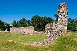 Berkhamsted Castle had, by this stage, fallen into disrepair and the lease of a ruined castle was possibly intended as some sort of royal joke; Carey owed a nominal annual rent of one red rose, payable yearly on St John the Baptist's Day (24 June).[1] Rather than live in the castle grounds, Sir Edward built for himself a mansion house on top of the hill overlooking the castle, and purloined stonework from the castle ruins to build his house.