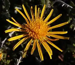 It is a perennial meso-chamaephyte that grows 15–25 cm high.[3] It has prickly leaves and grows dark yellow aster flowers.