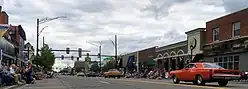 Downtown Berkley stretches along 12 Mile Road between Greenfield Road and Coolidge Highway, and along Coolidge Highway between 12 Mile Road and 11 Mile Road. Downtown Berkley is home to many restaurants, boutiques, clothing stores, and retail shops. Berkley's municipal offices, public library, and public safety headquarters are located near the intersection of 12 Mile Road and Coolidge Highway. Downtown Berkley hosts an annual Art Bash, which drew roughly 10,000 people to the city's commercial sector in 2016.[14] The Art Bash brings local artists from all over Michigan to sell art from photographs, garden art, jewelry and pottery to clothing accessories and paintings. Local stores and shops also participate in the festivities holding sidewalk sales. The city is an active participant in the annual Woodward Dream Cruise, a popular classic car showcase in the Metro Detroit area. Berkley hosts a classic car parade Downtown, called the Berkley CruiseFest. It holds the festivities one day before the official date of the Dream Cruise,[15] and has done so every year since 1995.[16]