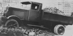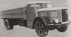 In November 1927, the company presented the GDHM, an evolution of the GDH[2] with the same payload[6] and a 12 tonnes GVW. It was initially delivered with the MLB5 engine.[5] As was the case with its predecessor, the GDHM had two lengths, with wheelbases of either 4,250 millimetres (167 in) or 4,950 millimetres (195 in). The wheels are either solid or pneumatic and double on rear. Brakes are of two types: servomechanical actioned by a pedal (for the front wheels) and mechanical actioned by a lever (for the rears).[7] In February 1928, Berliet launched a GDHM with reinforced chassis called the GDHMB,[8] increasing the payload to 7.5 tonnes,[6] 13.5 tonnes GVW. It had a version for dumpers with a derated engine, the GDHMB2. In August 1929, Berliet launched yet another GDHM derivative, the 12 tonnes GVW GDHP, basically the same chassis but with an inline-six petrol engine codenamed as MLPC3. The MLPC3 has a 125 mm bore and a 140 mm stroke giving 10,308 cc. The chassis also received a different inline-six engine with a 110 mm bore and a 140 mm stroke, being marketed in this case as GDHPB. Other derivatives followed: in 1930,[9] the 11.5 tonnes GVW[5] GDHL with the MLBC 110 engine, a derated MLB5; in 1931, the 17 tonnes GVW GDHE with the MLB5 as well as a gasifier-equipped GDHM and a GDHE with a more powerful MLB5 variant (MPA) marketed as GDHE 28 (the number making reference to the fiscal power).[9] Many of the petrol-engined GDs introduced from then on would include the fiscal power in their name.[10]