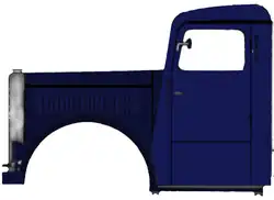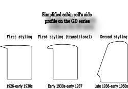 Various GDs shared specifications. All the diesels and most petrols generally have the same, rectangular profile cabin cell, with two doors opening from the rear side (as most vehicles today) and whose roof forms a projection acting as a sun visor above the windscreen. Only the bonnet's length, which opens like a butterfly wing as on all trucks of the time, differs depending on the type: the longer six cylinders are recognisable by their two-part bonnet sections. All GDs were delivered with 4-speed manual gearboxes, rear-wheel drive,[13] and leaf spring suspension. By the early 1930s, servomechanical brakes on the four wheels were standard.[12] Also by that time, the bodywork was slightly updated, with minor changes as the addition of a front bumper (early models do not have one).[14]