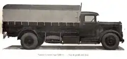 After the war started, many civilian GDs were requisitioned. Berliet produced mainly two GD series model for the military, the GDLS 30 and the GDRA.[37] The 10.85 tonnes GVW[35] GDRA (A for armée)[37] was a variant of the GDR type conceived from the start to be a military vehicle. The wheelbase of the GDRA was 4,860 millimetres (191 in), the width 2,475 millimetres (97.4 in), height 2,790 millimetres (110 in), the length 7,580 millimetres (298 in), the kerb weight 5,500 kilograms (12,100 lb).[38] Its engine was the MPF, an inline four petrol of 110 mm bore x 150 mm stroke (5,702 cc)[35] with a maximum power of 70 metric horsepower (51 kW) in military configuration.[38] It may have had horizontal slits on the bonnet instead of the vertical slits common to the rest of the GD series vehicle range, according to military diagrams, but it is not clear as no GDRA survived.[39] The GDRA was the first Berliet vehicle produced in an industrial scale since 1918. 1,880 GDRAs (bodywork with tarpaulin cover, tipper and tanker) were produced until the armistice. By comparison, the most produced GD series model in the interwar period was the GDR 7 of which 1,182 were built between 1936 and 1939 (including military versions and the forward control GDRK 7).[37]