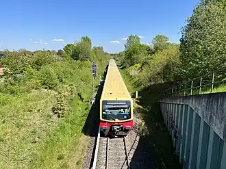 The first plans for a connection from the Anhalt Suburban Line at Lichterfelde to the town of Teltow and the Cemetery Railway (Friedhofsbahn) in Stahnsdorf already existed in the 1920s. In the 1930s, the Nazis were planning an extensive reconstruction of the Berlin railway infrastructure, especially in the south of the city. This S-Bahn line was planned. Between central Teltow and Stahnsdorf, a freight line would also run parallel to it to provide a more direct connection from the Großbeeren marshalling yard via Stahnsdorf to Potsdam.[2] Neither project was realised, but earthworks were constructed in several places. Provision was made for the planned line during the reconstruction of Lichterfelde Süd station up to 1943, including the building of two platforms.[3]