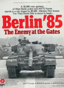 Berlin '85 is a game set in the 1980s during the Cold War in which the NATO forces in Berlin, composed of French, British, and American military units, and West Berlin Police, are attacked by Soviet/Warsaw Pact military units in a battle involving both time and attrition.[1] The game uses SPI's "Modern Battles Quad" rules with new rules for urbanized terrain, subways, fire storms, gas warfare, rubble, police, supply and airpower.[2]