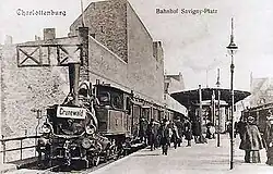 In 1872, the Deutsche Eisenbahnbaugesellschaft (German Railway Construction Company - DEG) filed the planning application for a railway line through the city, connecting the then-Schlesischer Bahnhof (today Berlin Ostbahnhof) to Charlottenburg, and continuing to Potsdam. In December 1873, the state of Prussia as well as the private rail enterprises Berlin-Potsdamer Eisenbahn, Magdeburg-Halberstädter Eisenbahn and Berlin-Hamburger Bahn bought shares in the DEG, and jointly founded the Berliner Stadteisenbahngesellschaft (Berlin City Railway Company). However, things did not go as expected and the DEG went into bankruptcy in 1878, which forced the Prussian state government to take over operations, pay for the construction of the line with state money and to reimburse the former private owners of the DEG.[4] The state's interest in the line was attributed to the military, which after the 1870-1871 Franco-Prussian War was of the opinion that the railway networks would hinder mobilisation when not properly interconnected.[5]