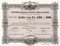 The main shareholders of the Bern-Lucerne Railway were the Canton of Bern and the Canton of Lucerne as well as some municipalities. However, many Emmental municipalities and the City of Bern showed little enthusiasm for subscribing for shares because they had already lost a significant amount of money in the failed Swiss East–West Railway (Ostwestbahn, OWB). Nevertheless, at the end of 1872, the Bern-Lucerne Railway had accumulated over CHF 14 million in the form of stocks and bonds, while construction costs were estimated at CHF 13.7 million.