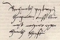 Signature of Bernard von Pretwicz as Captain on Bar in 1550: "Berhanrth prytwycz, Haupman auff baur with meyner eygen Hannth schryff"