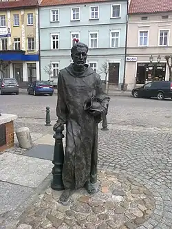 One of the legends associated with father Bernard was that some time around 1603, he arrived in the town of Grodzisk Wielkopolski from the Benedictine monastery in Lubiń to find the residents starving and the town's wells depleted.[7][8] The brewery was the primary source of income for the town and the hospital.[9] Bernard prayed for the wells, and a new source of water suddenly filled the Old Market Well. Legends claimed that the newly refilled well had the ability to make whoever drank from it healthy again, and the beer that was produced from the water was far superior to any of the beer the brewers had been able to produce before.[8] The well became a municipal treasure and was given credit for the commercial success of the town's breweries over the centuries to follow.[7] Between the years 1620 and 1815, the residents of Grodzisk made an annual pilgrimage to Bernard's tomb, to bring a huge barrel of the beer that they made from the well as a show of gratitude.[5][8][9] The tradition was resumed in 2003, on the urging of Henryk Szymański, the mayor of Grodzisk Wielkopolski.[10] On 5 September 2009, the city unveiled a sculpture of Father Bernard, 7 feet (2 m) tall, next to the Old Market Well.[10]