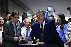 Arévalo was nominated as a presidential candidate in the 2023 general election and, surprisingly qualified for the second round, triggering accusations of electoral fraud and a judicial investigation into his party and its members, threatening the election results, which was widely condemned nationally and internationally. He defeated former first lady Sandra Torres in the second round on 20 August 2023.[4] His electoral victory made him the first son of a former Guatemalan president to be elected as president and the second individual not born in Guatemala to hold the office.[5][6] The Organization of American States stepped in to support and facilitate the presidential transition. Arévalo was sworn in on 15 January, following a lengthy delay in the certification of the results by the outgoing legislature of Congress.[7]