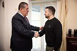 During his first trip as president to Europe, from 15 to 23 February, Arévalo temporarily delegated his duties to Vice President Herrera, as established by the Constitution. His itinerary included various activities and high-level meetings in different European countries. In Germany, he participated in the 60th Munich Security Conference and met with German Chancellor Olaf Scholz, Bulgarian Prime Minister Nikolai Denkov, Israeli President Isaac Herzog and Ukrainian President Volodymyr Zelenskyy. Later, on 19 February, he arrived in France to meet with French President Emmanuel Macron at the Élysée Palace. The next day, in Belgium, he held meetings with the President of the European Council Charles Michel, and the European High Representative of Foreign Affairs Josep Borrell, thus marking the first visit by a Guatemalan president to the seat of the European Union. On 21 February, Arévalo moved to Switzerland, where he held a meeting with the president of the International Olympic Committee Thomas Bach, who confirmed the elimination of sanctions on the Guatemalan Olympic Committee. Then, on 22 February, he arrived in Spain to meet with the Prime Minister Pedro Sánchez, and attend a banquet offered by King Felipe VI and Queen Letizia. Finally, on 24 February, Arévalo returned to the country.[63]