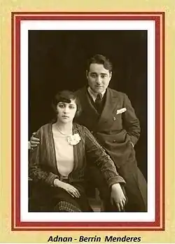Her husband Adnan Menderes became prime minister after the Democratic Party (DP) came to power in 1950. Adnan Menderes, who served as prime minister for 10 years, was arrested on May 27, 1960, when the DP was removed from power. He was executed on 17 September 1961 in İmralı Island.[2] Berrin Menderes lost her eldest son, Yüksel Menderes, in 1972. After her older sister Güzin Dülger died in 1975 and her middle son Mutlu died in 1978, she continued her life with her younger son Aydın. His brother Samim Yemişçibaşı died in 1985.[3]