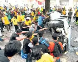 - At 4:16 pm, in another violent incident, unruly demonstrators were seen assaulting a policeman driving a police patrol car, causing him to fall unconscious, leading to the car crashing onto the pavement and accidentally ran over two people outside a complex.[53][54] The patrol car was vandalised thereafter.[72][92][93] A journalist for a local TV station TV Alhijrah, who tried to protect the injured policeman was also assaulted by the protestors.[94] The police car was later overturned by the protestors.[54]