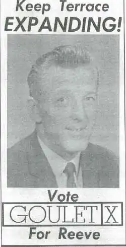 Albert “Bert” Goulet (May 12, 1918 – November 3, 2001) was a Canadian entrepreneur, community leader, and politician in Terrace, British Columbia. He served as a city councillor from 1962 to 1965, and as reeve (mayor) from 1965 to 1967.[1][2][3][4]