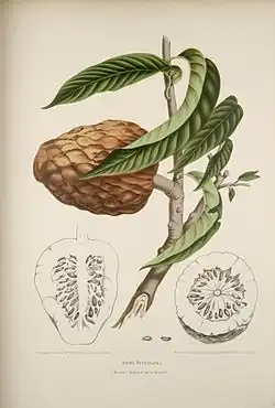Hoola van Nooten was also interested in the indigenous flora of Java and gave drawing lessons,[4] where she befriended the Javanese botanical illustrator, Radhen Salikin, who was familiar with the local flora.[5] She produced 40 plates depicting interesting plant species from Java, following the precedents set by Maria Sibylla Merian and Elizabeth Blackwell. The drawings would make up the illustrated work Fleurs, Fruits et Feuillages, choisis de l'île Java: peints d'après nature. The illustrations are accompanied by descriptions in French and English, describing the plant's history and uses.[6] The work was published in Brussels in 1863, and was dedicated to Sophia Mathilde, wife of King William III of the Netherlands, whose patronage she had acquired.[7]