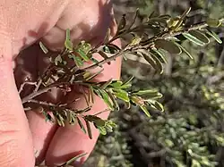Bertya oblonga is a shrub that typically grows to a height of up to 1.8 m (5 ft 11 in), its young branchlets densely covered with straw-coloured or greyish, star-shaped hairs. The leaves are narrowly oblong to strap-like or sometimes linear, 8–23 mm (0.31–0.91 in) long and 1.3–3 mm (0.051–0.118 in) wide with the edges flat or rolled downwards, the upper surface glabrous. Separate male and female flowers are borne on a peduncle 1.5–2.5 mm (0.059–0.098 in) long, the male flowers 30 to 45 stamens. Female flowers are on pedicels 0.4–1.2 mm (0.016–0.047 in) long, with narrowly triangular sepals 1.5–2.0 mm (0.059–0.079 in) long, hairy on the lower surface, and a densely hairy ovary. Flowering occurs from July to October, and the fruit is oval to elliptic, 7.5–9 mm (0.30–0.35 in) long with a single seed.[2][3][4]