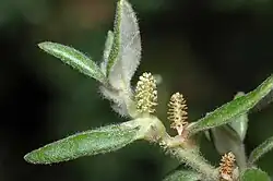 The flowers are sessile, the male flowers with five white elliptic to oblong sepal lobes 2.5–4 mm (0.098–0.157 in) long and 1.5–2 mm (0.059–0.079 in) wide and 47 to 53 stamens. Female flowers have five light green, egg-shaped to oblong sepal lobes 1.0–2.7 mm (0.039–0.106 in) long, 0.8–1.8 mm (0.031–0.071 in) wide and there are usually no petals. The ovary is nearly spherical, about 0.8–0.9 mm (0.031–0.035 in) long and wide and covered with star-shaped hairs, the style about 0.1 mm (0.0039 in) long with three spreading red to maroon limbs 1.1–4.5 mm (0.043–0.177 in) long, each with two to four lobes 0.6–3.5 mm (0.024–0.138 in) long. Flowering has been observed from June to September and in November and the seeds are mottled light brown 3.1–4.5 mm (0.12–0.18 in) long and 2.0–2.9 mm (0.079–0.114 in) wide.[2][3][4]