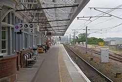 The station has a council-run car park nearby, and is staffed throughout the week during working hours.[6] Several self-service ticket machines are available for use outside these times and for collecting pre-paid tickets. Other facilities on offer on the concourse include a waiting room, Costa coffee shop, vending machine, payphone and toilets, whilst there is a First Class lounge on the platform. The two are linked by a fully accessible footbridge with lifts. Train running information is offered via digital CIS displays, audible announcements and timetable posters.