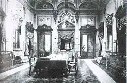 The casino was anchored by a grand dining room, which spanned 25 meters in length and 14 meters in width.[18][8] The dining room was furnished with dozens of tables arranged beneath a Renaissance-style ceiling, adorned with coffered panels and beams. These were supported by statues representing chimeras, and from their mouths hung imposing chandeliers made of nickel-plated copper, which were approximately seven meters in height.[18] The walls were adorned with the most exquisite landscapes of Franche-Comté, attributed to the region's most esteemed painters. These included the rocky outcrops and castle of Thoraise, the citadel as seen from the Micaud promenade, the shadowy islands of the Doubs, and a boating scene in Mazagran at the foot of the Chaudanne hill.[18] The kitchens and private salons were furnished with the latest in culinary and comfort amenities, complementing the installation of a building where the most esteemed chefs were in succession.[19]