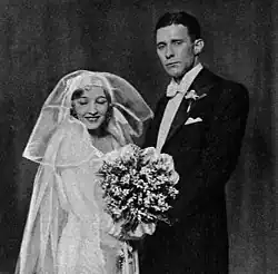Love married then-stockbroker William Hawks[58] at St. James' Episcopal Church in South Pasadena, California on December 27, 1929.[41][59] Blanche Sweet was her matron of honor;[60] Bebe Daniels, Carmel Myers, Norma Shearer, and Hawks's sister-in-law Mary Astor were among her bridesmaids; and Irving Thalberg and Hawks's brother Howard served as ushers. Adrian had designed a wedding dress for Love,[61] but she instead wore a silk charmeuse gown by Howard Greer.[62][63] The ceremony was attended by such celebrities as Cecil Beaton, Ronald Colman, Cecil B. DeMille, Hedda Hopper, Laura La Plante, Harold Lloyd,[64] Anita Loos, Ramon Novarro, and William Powell,[65] and it was mobbed by a crowd of 25,000.[60] The wedding and reception were documented by the press and by Beaton in his Diaries, where he wrote that Love "looked like a terrified bird" but "radiated love".[65]