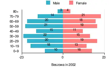 According to the 2002 Poland census, there were 279 people residing in Beszowa village, of whom 51.3% were male and 48.7% were female. In the village, the population was spread out, with 17.2% under the age of 18, 34.1% from 18 to 44, 24% from 45 to 64, and 24.7% who were 65 years of age or older.[1]