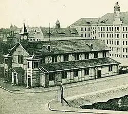 From 1904 to 1905, an interim church[1] was built in the courtyard of the school at Schnorrstrasse 2 / Rödelstrasse. The half-timbered building, which was rebuilt here under the direction of the architect Conrad Hermsdorf, had previously served as an emergency church for Leipzig's Andreas and Michaelis congregations. On 30 September 1906, the parish was separated from Kleinzschocher, and on 6 January 1907, the first two parish priests were assigned to Schleußig. On the First Sunday of Advent of 1910, a parish hall was inaugurated on the property at Könneritzstrasse 92.
