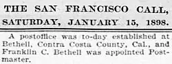 Though it was common for the era to name the post office after the postmaster, and for the communities to assume the name of the post office, there are some references to the area as "Bethell" referring to the Sand Mound Ranch farm established by a coalition led by Franklin's older brother, Warren King Bethell, Nicholas Harris (Sheriff of San Jose) and James C. Smith. Prior "owners" of these lands were considered "land speculators" and only performed the minimum amount of improvements to reclaim the land in order to secure land patents. This may not be a fair assessment of all, since some did make an honest attempt to reclaim the lands only to be forced out by changes in governmental policy and financial constraints.