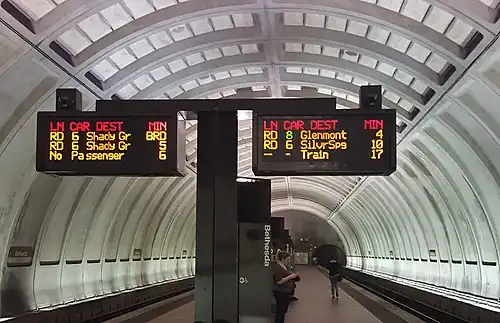 Bethesda station is a rapid transit station on the Red Line of the Washington Metro system in Bethesda, Maryland. It is one of the busiest suburban Metro stations, serving on average 9,142 passengers each weekday in 2017.[2] The Purple Line, a light rail system currently under construction, will terminate at Bethesda, providing rail service to other inner Maryland suburbs such as Silver Spring and College Park, each of which has additional north–south connections by Washington Metro, and New Carrollton, which has Amtrak and MARC connections to both Washington, D.C., and Baltimore.