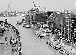 Pennsylvania Shipyards in Beaumont, Texas. C1 Cargo vessels under construction with welding barges are moored.