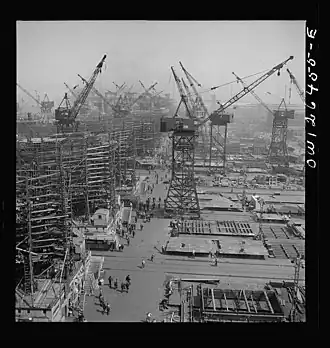On 27 September 1941, Fairfield hosted Liberty Fleet Day, with the launching of their first Liberty Ship, SS Patrick Henry. She was the first of an eventual 384 Liberty ships built there, along with 45 LSTs, and 94 Victory ships.[1][2]
