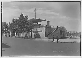 In September 1936, work started on converting the main pool to winter use, with workers temporarily draining the pool and adding basketball, handball, shuffleboard, tennis, and volleyball facilities.[41] The original bathhouse was destroyed by fire on August 17, 1937,[47][48][49] and the pool was closed for the rest of the season.[50] Park commissioner Moses's letter to La Guardia, addressed three days later, advocated for the total replacement of the bathhouse.[41] The pool area was reopened for the 1938 season,[51] with a temporary one-story structure that housed the showers. The current one-story bathhouse was opened on May 27, 1939.[41][49] By 1941, the other athletic facilities in the larger southwestern portion of the park were nearly complete.[52]