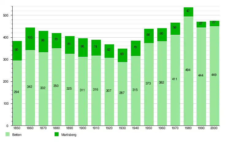 Betten is first mentioned in 1243 as Bettan.[4] Martisberg is first mentioned in 1311 as Martisperg.[5]
