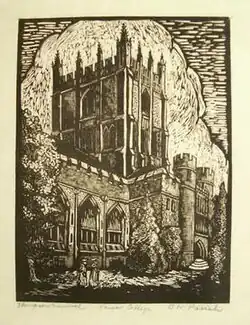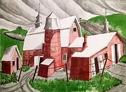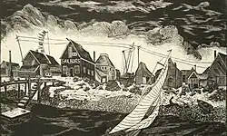 During the remainder of the 1930s Parish continued to exhibit exhibited etchings, woodblocks, and watercolors in the Washington Square outdoor exhibits and Fine Arts Guild.[13] Her work also appeared in group shows at places such as the Corcoran Gallery[14] and the galleries of the Municipal Art Committee.[15][note 5] She also joined and began appearing in annual exhibitions of the National Association of Women Painters and Sculptors.[17] In 1939 she was awarded a prize in the National Association of Women Painters and Sculptors fiftieth anniversary exhibition.[18] An image of the prize-winning painting, a landscape called "The Lower Lot," appeared with the New York Times article describing the show.[18] During the late 1930s she made prints as an employee of the Federal Art Project of the Works Progress Administration.[19]