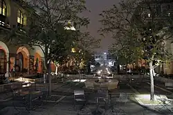 The park was created by the developers of the Montage Beverly Hills hotel.[3] It has landscaped gardens (including sycamores, topiaries and tulip trees), walkways with colonnades on each side, and dining tables.[2][3][4] The fountain in the center was handcarved in Israel.[4]
