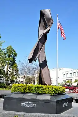 The project was initiated in 2009, when Beverly Hills Fire Chief Timothy J. Scranton announced they had acquired a 30-foot, 1,900-pound bent floor beam taken from the wreckage of the World Trade Center.[2][3][4][5] Around the beam, there are curved granite benches, meant for visitors to reflect upon the tragedy.[3] Behind the beam, there are replicas of the Twin Towers, the Pentagon and the field near Shanksville, Pennsylvania.[4][5] There are also stainless steel plaques with the names of the 2,977 lives lost that day.[3] Construction of the monument was overseen by McCoy Construction.[2][5] It was entirely funded by private donors, who collectively gave over US$600,000.[2][3][6] Their names are inscribed on the monument, as can be seen on the picture.