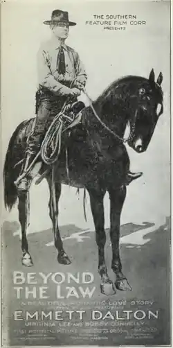 Emmett Dalton wrote a serial story recounting "the exploits he and his brother outlaws perpetrated."[1] Titled Beyond the Law, it was published in The Wide World Magazine, a London monthly, starting in May 1918.[2][1] The same month, Dalton moved to Gastonia, North Carolina, as did the company he was the general manager of, the Southern Feature Film Corporation.[3] The company published a half-page notice in the local paper, announcing their intention to make Beyond the Law into a movie, which it described as "a beautiful, historical, romantic story written around the lives of the Dalton Boys."[4] A newspaper article in mid-July reported that production of the film was due to begin later that month requiring at least 30 people, and expected to last four or five weeks.[5] An article the following week reported that Dalton was going to New York City to film interior scenes at the Famous Players Studio, with outdoor scenes to be filmed later in Bat Cave, North Carolina, and at Pawnee Bill Ranch in Oklahoma.[6] References to the finished film, "a special six-reel feature", began to appear in early December.[7]