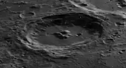 This is a relatively fresh crater with a nicely terraced inner wall. This terracing is most notable along the southeastern half of the crater, and nearly disappears along the north-northwest rim where the inner wall is at its minimum extent. The rim and inner wall have not been significantly eroded, and there are no craterlets of note along the rim.
