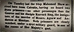 He was exiled to Singapore in 1850 by the British authorities due to his anti-colonial, revolutionary activities in Punjab.[1][2] The ship that he was transported on to make the journey to Singapore was the Muhmed Shah or Muhammad Shah.[12] It disembarked from the Port of Calcutta on 15 May 1850.[3] He arrived in Singapore, alongside his closest disciple Khurruck Singh, on 14 June 1850, being the first Indian freedom fighter to be sent there.[10] Other sources claim his date of arrival in Singapore to be 9 July 1850.[3] He was imprisoned in New Jail on Outram Road (also known as 'Outram Prison'), being held in solitary confinement for years.[1][2][3] His cell was located on an upper story, with the two windows in the room walled-up, and the verandah was enforced with an impenetrable iron gate.[10] By dimensions, the cell was 14 by 15 feet and as per British admission was: "... further rendered dark, dinghy and absolutely unhealthy" (Secret Consultation Papers, 28th Feb 1851, #52-57).[12][3]