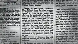 - ^ a b c d e f g Chahal, Simmi; Bhullar, Sukhjit Kaur (April 2018). "Bhai Maharaj Singh, First Sikh Freedom Fighter" (PDF). International Journal of Creative Research Thoughts. 6 (2): 56–61. ISSN 2320-2882.