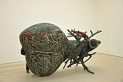 Bharti Kher has worked in a variety of media creating paintings, sculptures, installations, and text.[5][9] Kher's primary material is manufactured versions of traditional Indian bindi.[10][11] Throughout her career Kher has kept some repeating patterns in her paintings from her student years from the late 1980s to the early 1990s.[12] Kher considers how the realities of human life is perceived in our current time.[13] Her works displays fondness towards human drama, as well as intrinsic love.[12]