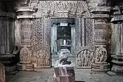 The outer wall of the temple has projections and recesses creating niches. In these niches are miniature decorative towers in relief (called aedicula or turrets), the execution of which evolved during the Later Chalukya rule. The Vesara style aedicula are supported by double pilasters while the Dravida (south Indian) style aedicula is supported by single pilasters. The art historian Percy Brown calls the Later Chalukyan style of wall decoration "exceptionally well rendered", and according to Kamath, the miniature towers are wrought in a "most artistic refrain".[5] Each tier of the superstructure has a kirtimukha (gargoyle like face). Below each kirtimukha, is a relief of a deity such as the Nataraja or Maheshvara (both forms of the Hindu god Shiva). Worthy of mention is the ornate relief on the lintel and door jamb at the entrance to each sanctum (garbhagriha) which exhibit Saiva dvarapalas ("guardians" to a shrine of the god Shiva) flanked by female umbrella (chauri) bearers. Facing the west sanctum is a small sculpture of Nandi the bull. There are sculptures of various deities from the Hindu pantheon in the niches in the interior wall of the temple, such as Ganesh (elephant headed god of "beginnings" in Hinduism), Mahishasuramardhini (a form of Durga) and the Saptamatrika (the seven Hindu goddesses). The ceiling in the common hall is supported by four polished lathe turned pillars, which according to Kamath is also a characteristic feature of Western Chalukya temples.[4]