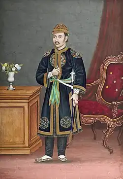 The premature death of Pratap Singh Shah (reigned 1775–77), the eldest son of Prithvi Narayan Shah, left a huge power vacuum that remained unfilled, seriously debilitating the emerging Nepalese state. Pratap Singh Shah's successor was his son, Rana Bahadur Shah (reigned 1777–99), aged two and one-half years at his accession.[16] The acting regent until 1785 was Queen Rajendra Lakshmi, followed by Bahadur Shah (reigned 1785–94), the second son of Prithvi Narayan Shah.[17] Court life was consumed by rivalry centered on alignments with these two regents rather than on issues of national administration, and it set a bad precedent for future competition among contending regents. The exigencies of Sino-Nepalese War in 1788–92 had forced Bahadur Shah to temporarily take a pro-British stance, which had led to a commercial treaty with the British in 1792.[18]
